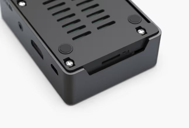 We included rubber feet to raise the enclosure so it just hovers underneath your television. In addition to the built in heat sink, small GPIO pins are accessible through the slot on the bottom of the case and there is no need for disassembly to get to the SD card. We know you will love the attention to detail we put in throughout the case.