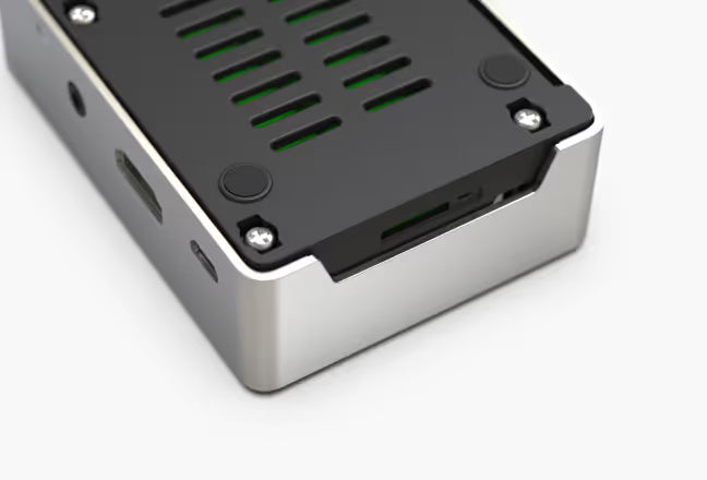We included rubber feet to raise the enclosure so it just hovers underneath your television. In addition to the built in heat sink, small GPIO pins are accessible through the slot on the bottom of the case and there is no need for disassembly to get to the SD card. We know you will love the attention to detail we put in throughout the case.